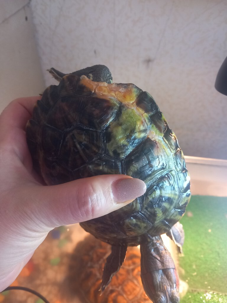 Г Хабаровск красноухая черепаха содержание в контейнере есть лампа накаливания, Уф. Фильтр кормлю креветками гаммариусом рыбой с/ м.есть обогреватель. Фильтр внутренний. Возраст черепахи 1.5 года. Ест 1 раз в день. Грунт есть камушки. Есть островок. Болезнь проявилась месяца 3 назад. Повелел панцирь местами потом покраснение под ним. Повезли в ветеринару. Сказала почки пролечили почки. Короли уколы и витамины. Прошло 2 недели начал разваливается панцирь. Прямо кусочек отвалился. И местами белый. Черепаха ест хорошо, активна