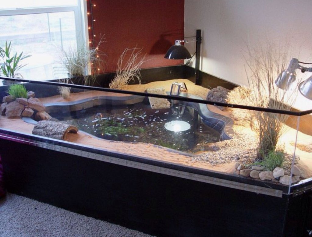 Здравствуйте. У нас несколько дней как появилась красноухая черепаха. Отдали нам её в маленьком аквариуме. Жалко его места в нем нет совсем. Решили сделать ему место в таком стиле. Хочу взять искусственный водоём на 140 литров. Хватит ли этого объёма? Если нет то посоветуйте на сколько литров лучше взять. Каким покрытием можно заменить песок. Хотела использовать коврики эмитация травы но читала, что черепахи его грызут. И хотелось бы зелень какую нибудь в горшках поставить, какую можно, что бы черепаха не отравилась. Может укрытия нужны. Опыта в содержании нет совсем. Посоветуйте как всё обустроить, что бы черепаха было комфортно и не навредить.