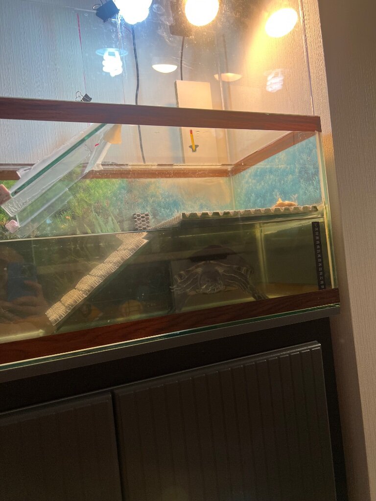Черепаха красноухая Красноухая черепаха водная Пол женский, аквариум 100л, объем воды 50л 4.1 Лампа накаливания repty zoo 35w, 30 см над островком, работает 12 часов в день 4.2 УФ лампа reptispa desert uvb 10%, 13w, расположена 30 см над островком, меняю раз в 8 месяцев, работает 12 часов в день. 4.3 Берег в аквариуме встроенный из стекла, сверху резиновый коврик. 4.4 Фильтр внешний Barbus на 100 л, 650л/час. Чистка фильтра 1 раз в месяц 4.5. Нагреватель погружной до 50 л, температура воды в аквариуме 27. Грунта нет. Температура воды 27, На суше 30. Подмена воды 1/3 раз в неделю. Воду отстаиваю около недели. Корм: tetra repto min. Корм даю во вт и в сб, 2 раза в неделю. ИНогда 2-3 раза в месяц даю в чт микс сушеных рыбок как лакомство + сушеная львинка, гамариус 1 десертную ложку. Подкормки : Кость каракатицы есть всегда в аквариуме. Возраст 9+, размер: длина 19см,ширина 17 см высота 10см. Вес 1623 гр. Проблема с количеством воды в аквариуме. Я сделал трап и площадку приклеил сегодня. И сделал надстройку чтобы сера не смогла совершить побег. Мне нужно от вас благословление, господа форумчане на это дело. Завтра я залью аквариум полностью. Нижний мостик пока убирать не буду, он там приклеена оченхорошо, уберу в дальнейшем может нижний трап. В общем мне нужно ваше мнение. https://postimg.cc/gallery/q4CGS35