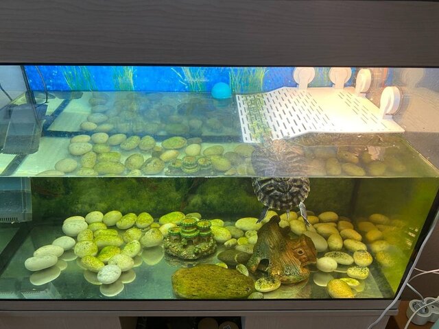 Из какого вы города (области)? Ваш возраст? Химки, 28 Вид черепахи? Если не знаете, просто укажите водная. Красноухая черепаха Где содержится (пол, аквариум, террариум, контейнер)? Размер жилища? Какой объем воды в литрах? Акватеррариум 300 литров (заполнение около 200 литров) Какое стоит оборудование? 4.1. Установлена ли лампа накаливания в качестве точки прогрева? Сколько часов работает в день? Установлено 2 зеркальные лампы 40 Вт, работают 12 ч в день по таймеру 4.2. Установлена ли ультрафиолетовая лампа? Если да, то с каким спектром UVB%? Как называется и как давно установлена? Сколько часов работает в день? Установлена 1 лампа Arcadia Mini Triple U D3+ 12% 13W, через месяц будет ровно год, работает 12 часов в день по таймеру 4.3. Установлен ли берег? Что используется в качестве берега? Установлен пластиковый берег на присосках без искусственной травы 4.4. Установлен ли фильтр для воды, если да, то какой, внешний/внутренний? Какая мощность? Внутренний фильтр PUMP FH-1902 19 вт, 1500 л/ч 4.5. Установлен ли нагреватель воды? Нет, без него температура воды стабильно 24-25 градусов Имеется ли грунт в жилище черепахи? Если да, то какой? Имеется крупная галька Какая температура в жилище черепахи (воздуха/воды)? вода 24-25 градусов, воздух 25 градусов Что черепаха ест и как часто? Какие даете подкормки и как часто? Есть корм Reptomin junior и Stiks раз в 2 дня, иногда подкармливаем сепией и салатом романо (его ест очень плохо) Возраст, точный вес и длина панциря черепахи? В чём проблема/болезнь? Как давно проявилась? 1 год и 3 месяца, вес 418 грамм, длина: карапакс - 14 см, пластрон - 13 см. Уже 2-3 недели черепаха практически не ест, съедает 1-2 палочки. не вялая, порой даже гиперактивная, болтыхается в воде, словно что-то выпрашивает, брызги аж долетают до ламп. Иногда целыми днями сидит на суше, но бывают и дни, проведенные в воде. Кормим в аквариуме, не в отсаднике (в нем не ест). Периодически пропылесошиваю дно, но все же наблудаю, как она иногда подъедает остатки корма из-под камней, иногда ест свой кал. Обращались ли в ветклинику? Как называется ветклиника? Как зовут врача (ФИО)? Вводились ли какие-то препараты, если да, то в каких дозировках? Что было сделано по рекомендациям врача? Не обращался К анкете приложите фотографии жилища и самой черепахи (чтобы на ней была видна черепаха и её болезнь, а также: вид сверху, по бокам, пластрон). Переместите фотографии в поле редактора сообщений или нажмите на кнопку в редакторе "Выберите файлы" (суммарный вес прикрепляемых изображений 5MB, если ваши изображения превышают указанный размер, то воспользуйтесь любым хостингом изображений, и прикрепите ссылки на размещенные изображения в десятом пункте анкеты).