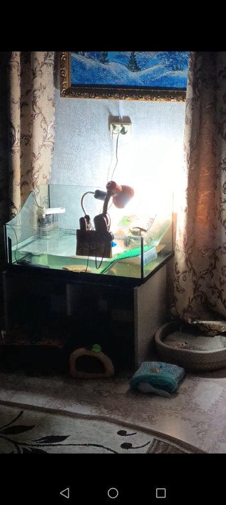 @Усман здравствуйте! Лампа относительно острова установлена верно (высота - это отдельный вопрос), но это не уф-лампа, а вредная китайская галогенка 2-в-1, которая не подходит ни как источник уф, ни как источник тепла. Вам нужны две лампы: обычная (лучше зеркальная) лампа накаливания на ~40-60вт (галогенки, красные и керамические лампы не подходят!) и ультрафиолетовая лампа для рептилий от 10-12% UVB - из бюджетных можете взять SparkZoo 10% 26вт, Zooda 12% 26вт, на крайний случай - Lucky Herp 15% 26вт. Уф-лампы, в зависимости от характеристик, устанавливаются над сушей по-разному (для первых двух перечисленных ламп высота подвеса будет ~20см от черепахи, для третьей ~15см от черепахи). Греющая лампа устанавливается так, чтобы температура на суше была 30-32 градуса. В целом данный аквариум очень мал для содержания даже одного малька. Как черепахи будут выходить на сушу по высокому скользкому трапу - тоже не понятно - здесь нужно будет сделать покрытие - как вариант, противоскользящий коврик для ванны на присосках. В целом минимальные условия для одного малька выглядят так: На одного малька нужно от 50л залитой воды - это как минимум емкость на 100л, залитая пополам. Им нужны литры, чтобы плавать, нырять, исследовать дно, а вместе с этим сжигать калории и формировать опорно-двигательный аппарат, но при этом не плавать в своих отходах и продуктах их разложения; Нужна просторная суша и две лампы (см. выше); Обе лампы (греющая и уф) должны располагаться над островом (а не над водой), одновременно светить в центр острова сверху вниз (а не по-диагонали с другого конца аквариума) 10-12 часов сутки и создавать одно световое пятно; Им нужен детский корм Reptomin Baby/Junior (гаммарус, мотыль, сушеных насекомых и прочую гадость им давать нельзя!) - до ~10см по панцирю можете кормить каждый день (далее переходят на 1 раз в 2-3 дня) 1 раз в сутки утром/днем - по размеру порции пока ориентируйтесь на 1 объем головы черепахи; В качестве дополнительного источника кальция в аквариуме всегда должна плавать сепия - нужно снять ножом верхний твердый слой и крошить небольшими кусочками (до ~5мм) по мере съедания в воду; Оптимальные температуры: в воде 24-26, на суше 30-32; Скорость работы внутреннего фильтра должна равняться как минимум [объем залитой воды*10], но в итоге все упирается в объем фильтрующего материала, который у внутренних фильтров традиционно мал, поэтому в приоритете внешний фильтр с большим объемом фильтрующего материала - внешний фильтр должен быть рассчитан как минимум на 2-3 объема залитой воды; Все камни должны быть как минимум в 2 раза больше головы черепахи; В новом аквариуме также не лишним будет установить отмель (как вариант, мыльница или утопленный остров на присосках или подвесах) и чесалку (по поиску бьется как "ершик для бокалов на присосках" - лучше держится и удобнее в эксплуатации ершик на 3 присосках).