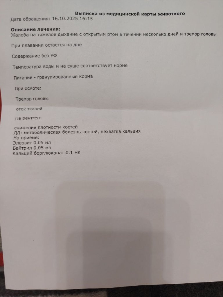 Здравствуйте! Все эти дни мы пытаемся помочь Матильде. После первого курса лечения состояние не улучшилось, а скорее наоборот. Обратились в другую ВК, там был исследован её кал, кровь. По заключению экзотолога дальнейшее консервативное лечение бессмысленно, назначена операция по извлечению яиц. 18.10.25 утром я отвезу её в клинику на операцию и буду ждать вестей. Очень переживаю, очень надеюсь что всё-таки вытянет! Доктор предложила получить альтернативное мнение от герпетолога из Ростова-на-Дону! В целом её заключение такое же. По многим показателям -острая почечная недостаточность и она не жизнеспособна. Шанс на выживаемость очень низок. Но если всё-таки проснётся- будем лечить её дальше. Я доверяю врачам и нашему и из Ростова, но тем не менее не могу понять, почему нельзя что-то начать делать уже сейчас. Если анализ крови на руках и диагноз выставлен. Почему только после операции? Не кормлю её сейчас, вижу что хочет есть: ловит мои пальцы в воде, как когда кормила её. Вчера вечером чуть более активна была, ходила на суше и так же в воде: ныряла с острова (чего уже давно с 17.09 не было) Поцарапанное веко заживает, правда периодически она чешет его лапкой. Но я его обрабатываю и раствор ромашки в аквариум добавляю. Раскрывает его практически полностью. Отеки глаз вчера стали меньше, не сошли совсем, но в сравнении с днём раннее.. Пытаюсь смириться что шансов нет, но такое сильное ощущение что она сможет, выживет (может это просто моя надежда)
