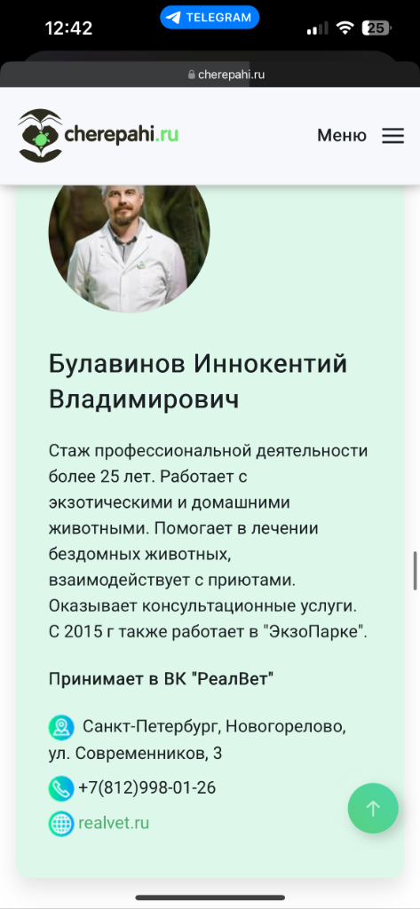 2. СРОЧНО, помогите найти контакт специалиста! Добрый день, форумчане! В топике со специалистами нашел ветеринара, который живёт недалеко от меня, набираю номер, а то не действителен. Булавинов Иннокентий Владимирович 2 Санкт-Петербург, Новогорелово, ул. Современников, 3 +7(812)998-01-26 CD realvet.ru Помогите пожалуйста найти действительный номер специалиста. Фото прикрепил.