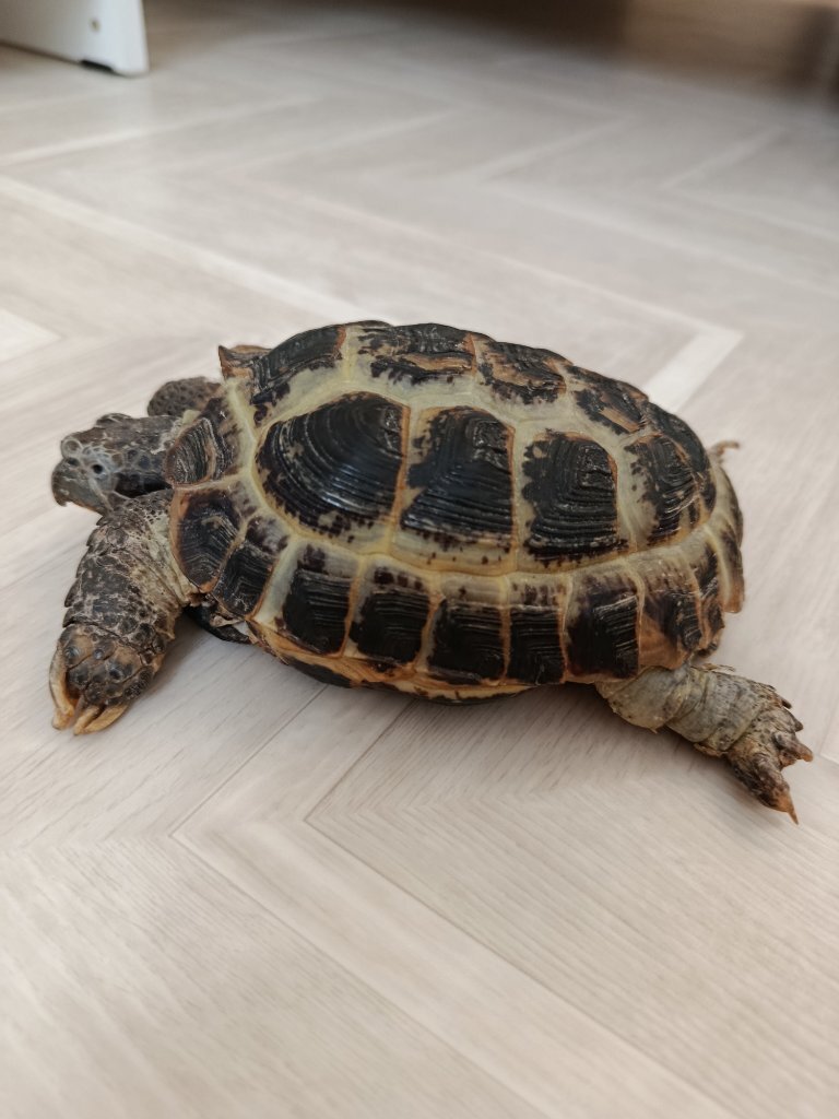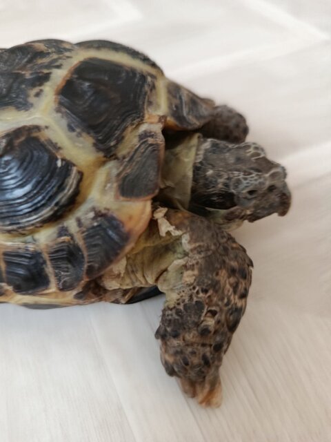 2. 1) Трёхгорный, Челябинская область, 16 лет. 2) Среднеазиатская 3) сейчас на полу, я насыпала ему кокосовый грунт в большой контейнер, специалбно купленный для него, но ему не нравится запах, он шипит и то ли чихает, но соплей нет, просто запах у этого грунта воняет землёй, прям горько, мне самой не нравится 4) 4.1 греющей лампы нет 4.2 Есть УФ лампа от Boshi UVB 3.0 и 50W. Установлена уже 2 месяца, черепаха греется, но я понимаю что УФ лампа имеет специальные лучи для выработки д3 витамина, и очень не полезно для здоровья ей просто греться, но увы греющую лампу пока не преобрела. 5) Как уже сказала, ему не понравился кокосовый субстрат, мне советуют купить супесь, но нигде не могу найти, даже в онлайн магазинах, ткань черепаха среднеазиатская, и нужна окр. среда как в пустыне, ну вот( 6) Под лампой УФ 30-32 температура, а в комнате 21-25 7) Каждые 1-2 дня даю листья салата, петрушку, укроп, натертую морковь, иногда яблоко или грушу (очень редко, и мало) У меня минеральный mix (общеукрепляющий) от Зоомир,но недавно узнала что он плохая добавка для черепах, там в основном кальций 33%, и у черепахи нет изменений во внешнем виде или самочувствии. 8) 10 лет, вес 344 грамма, длина панциря 13 см. Проблема в том что у черепахи плохо проходит линька, мало витаминов. Раньше у него был авитаминоз, и он даже солями не ходил, начала давать эту добавку от Зоомира и власть на 30 мин под УФ лампу, стал чувствовать себя лучше и солями начал ходить, ну и также купать раз в неделю начала. Я думаю у него проблема с линькой из-за недостатка витамина А и Д3, и + Е. Я заказала витаминную добавку от REPASHY calcium plus, прочитала в статье сайта что это одна из лучших добавок, дорогой, но отзывов много. Вот и хотела спросить, сколько раз давать эту добавку вместе с пищей? Убирать ли тогда минеральный микс от Зоомир, если говорится что в REPASHY calcium plus уже все есть? И подскажите пожалуйста бюджетный вариант просто греющей лампы и УФ лампы. И можете сказать какой торф насыпать в контейнер, если все кокосовое ему не нравится, а на полу лежать тоже не есть хорошо, что-то нейтрально пахнущее и удобное для кожи черепахи. Проблемы с линькой начались год назад, но мы думали что он просто в спячке и кожа сухая слишком, но сейчас стали усердно ухаживать за ним. У него просто торчат куски кожи и сухость на мордочке, но не отбирается, будто кожа отошла, но не отпадает, я не стала специально отрывать кожу ему. Меня смущает вид его брюха, белое в чем-то. 9) В нашей ветклинике работают только с кошками и собаками, герпетологов нет(((