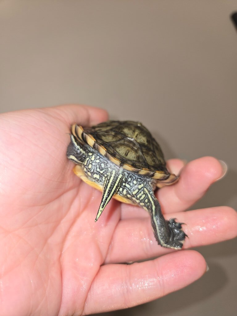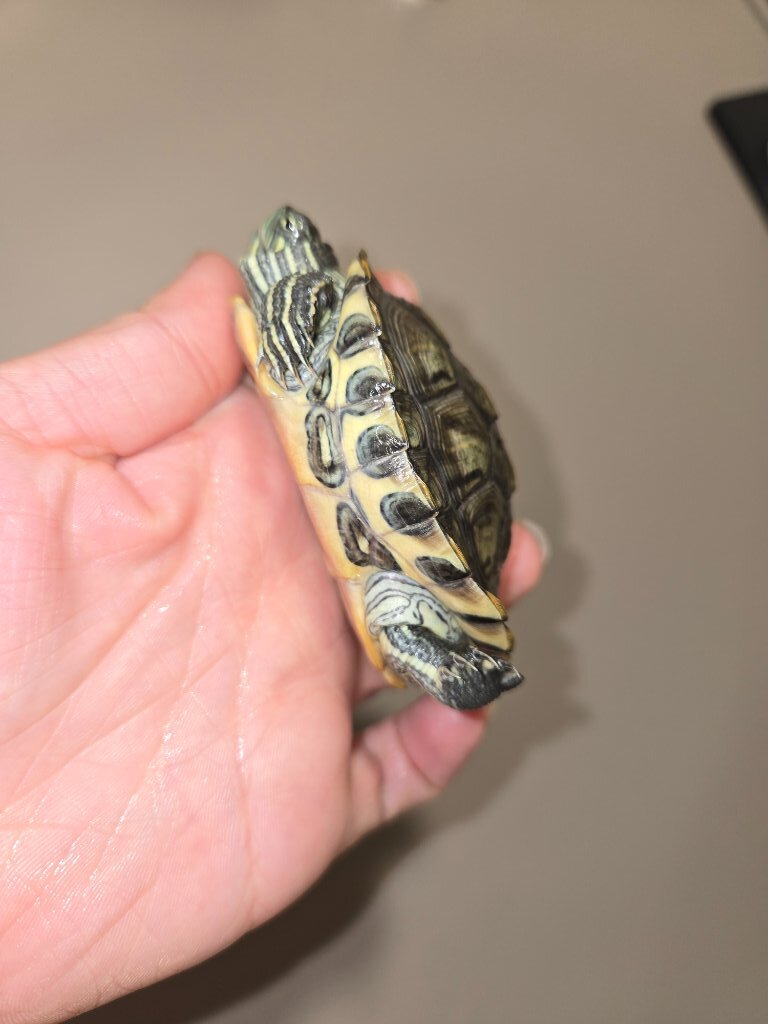 1. Из какого вы города (области)? Ваш возраст? Московская область, г. Королёв. 16 лет 2. Вид черепахи? Если не знаете, просто укажите водная. Красноухая черепаха 3. Где содержится (пол, аквариум, террариум, контейнер)? Размер жилища? Какой объем воды в литрах? Содержится в аквариуме. Размер: 40×65×42 Объем 109 литров, залито около 75 4. Какое стоит оборудование? Стоит фильтр акваэль фан 3, обогреватель, мыльница (как мель), островок на присосках, чесалка, лампы стоят. и уф лампа spark zoo 26 вт и зеркальная лампа накаливания 40 вт. 4.1. Установлена ли лампа накаливания в качестве точки прогрева? Сколько часов работает в день? да, установлена. я с утра включаю, а на ночь выключаю. но во время поездки была включена постоянно. 4.2. Установлена ли ультрафиолетовая лампа? Если да, то с каким спектром UVB%? Как называется и как давно установлена? Сколько часов работает в день? установлена уф лампа spark zoo 26 вт. установлена уже около 4 месяцев. также с утра ее включаю, а на ночь выключаю. 4.3. Установлен ли берег? Что используется в качестве берега? да, установлена. островок на присосках, но уже маленький становится, скоро буду менять. 4.4. Установлен ли фильтр для воды, если да, то какой, внешний/внутренний? Какая мощность? внутренний фильтр акваэль фан 3. 4.5. Установлен ли нагреватель воды? да. но он достаточно старый, я не знаю ни названия ни мощности. температура установлена на 25. 5. Имеется ли грунт в жилище черепахи? Если да, то какой? нет 6. Какая температура в жилище черепахи (воздуха/воды)? температура воды стабильно 24 - 26. воздуха иногда колеблется, но держится в районе 30. 7. Что черепаха ест и как часто? Какие даете подкормки и как часто? каждый день с утра черепаха ест рептомин бэби. в аквариуме в свободном доступе плавает чищеная сепия. во время поездки ее кормила автокормушка, которая очень много сыпала корма, поэтому переедала черепашка... плюс, в автокормушке был микс из рептомина стикс (поломанного), рептомина бэби и серы раффи пи 8. Возраст, точный вес и длина панциря черепахи? В чём проблема/болезнь? Как давно проявилась? возраст около 3 месяцев (появилась в августе). точный вес напишу сегодня вечером/завтра, когда куплю весы электронные. длина панциря около 7 см. проблема в том, что после моего возвращения из поездки я обнаружила, что у черепашки как будто бы ожирение что ли.... ну прям свисает кожа из панциря в районе лапок. а ещё, как будто бы из-за этого он не может полностью голову засунуть в панцирь... кормила его автокормушка и видимо очень сильно перекормила... когда я дома, то кормлю его сама в отсаднике, но он всегда как будто бы голодным остается, несмотря на то, что вроде бы как он ест даже чуть больше нормы (я ему иногда могу дать корма больше, чем 1,5 его головы). потому что он чуть ли не выпрыгивает из аквариума, чтобы я его покормила, ест свой кал и так далее... а сейчас его как будто раздуло и я переживаю очень... ещё в разделе по содержанию, куда я обычно пишу, мне сказали, что у него как-то неважно панцирь выглядит, поэтому более близкое фото панциря тоже приложу. 9. Обращались ли в ветклинику? Как называется ветклиника? Как зовут врача (ФИО)? Вводились ли какие-то препараты, если да, то в каких дозировках? Что было сделано по рекомендациям врача? нет 10. К анкете приложите фотографии жилища и самой черепахи (чтобы на ней была видна черепаха и её болезнь, а также: вид сверху, по бокам, пластрон). П