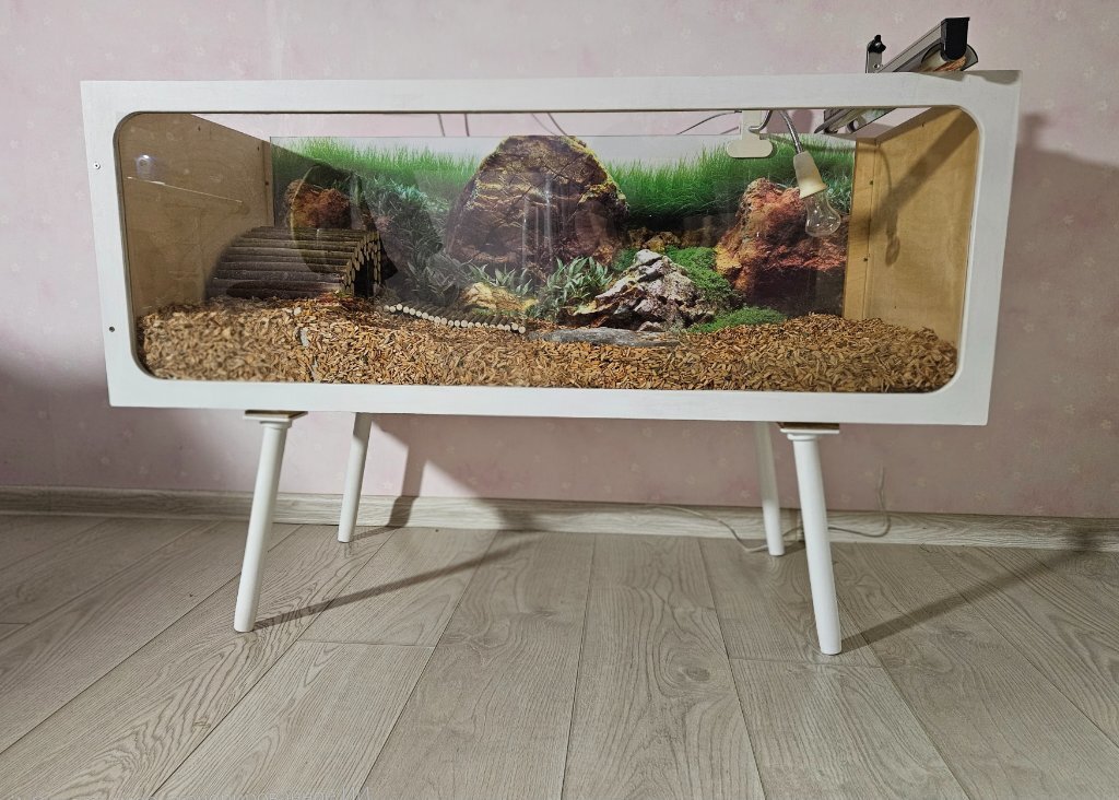 Террариум для сухопутных черепашек и других мелких зверюшек 110х50х50 см https://ozon.ru/t/Dy97tSt Купила данный террариум , немного доработала. Получилось вполне симпатично я считаю:). Сборка очень простая, справилась сама.