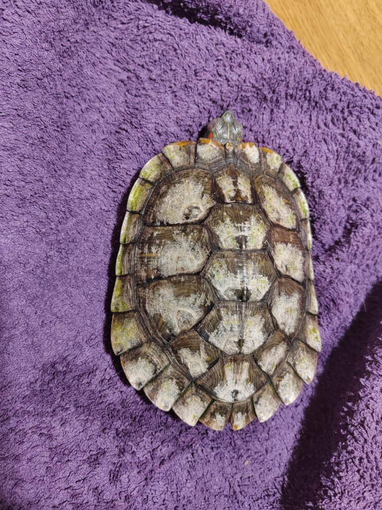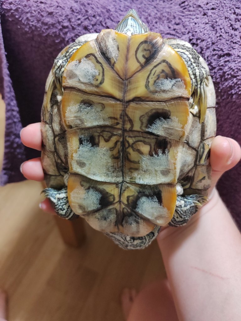 1.Нахабино, Московская область. 26 лет. 2. Красноухая черепаха. 3. Аквариум 25 литров. Размер с крышкой 365х315х275 мм. Мостик с газоном 150*150*110 мм. Размер террариума 355х305х250 мм. 4. Светильник для рептилий на прищепке с ультрафиолетовой лампой uva+uvb. Фильтр - помпа для аквариума AQUAEL FAN FILTER MINI plus (30 - 60 л, 260 л/ч, 4.2 Вт) внутренний, погружной, для рыб и черепах 4.1. Лампа работает с 7 утра до 21:00. 4.2. Лампа одна, работает с 7 утра до 21:00. 4.3. Берег есть, стандартный с акавриумом 4.4. Фильтр - помпа для аквариума AQUAEL FAN FILTER MINI plus (30 - 60 л, 260 л/ч, 4.2 Вт) внутренний, погружной, для рыб и черепах 4.5. Нагреватель для воды нет. 5. Грунта нет. В аквариуме есть ракушки (крупные). Несколько камней (крупные). 6. Температура воды 28°-32° 7. Редко кушает живых рыб - маленькие гуппи (1 раз в 3-4 месяца) Очень часто - креветки (1 раз в неделю), куриная грудка (1раз в неделю). 8. Точного возраста не знаем. Привезли с Анапы в 2023 году. На тот момент был совсем маленький - панцирь, примерно 3-4 см. Сейчас панцирь - 13, 5см. Точный вес 309 гр Проблема следующая: в мае 2025 года появился налёт на панцире. Особого внимания не обратила на это. Аппетит был хороший, активность не снижена. В конце мая уехали в отпуск, Сэма (так зовут черепашку) отдали свекрови. У неё в квартире аквариум стоял на полу. В квартире было достаточно прохладно. Черепаху переодически выпускали гулять. Скорее всего Сэм простудился. Когда мы его забрали от свекрови, у него уже были закрыты оба глаза. Дома начали лечение из интернета: Тобрекс капли в глаза 2р/д, тетрациклиновая мазь также 2р/д. Вчера Сэм открыл один глаз. Но вечером, перед сном начал попискивыть. Аппетит у него не снижен, кушает он также хорошо. Сегодня, когда делали процедуры с глазами из левого глаза вытащили много гноя. Левый глаз стал тоже открывать по чуть-чуть. Раньше попискиваний не было. Очень хочется помочь черепахе, не знаем как. По условиям содержания будем исправляться. 9. В вет. клинику не обращались. На данный момент нет возможности.