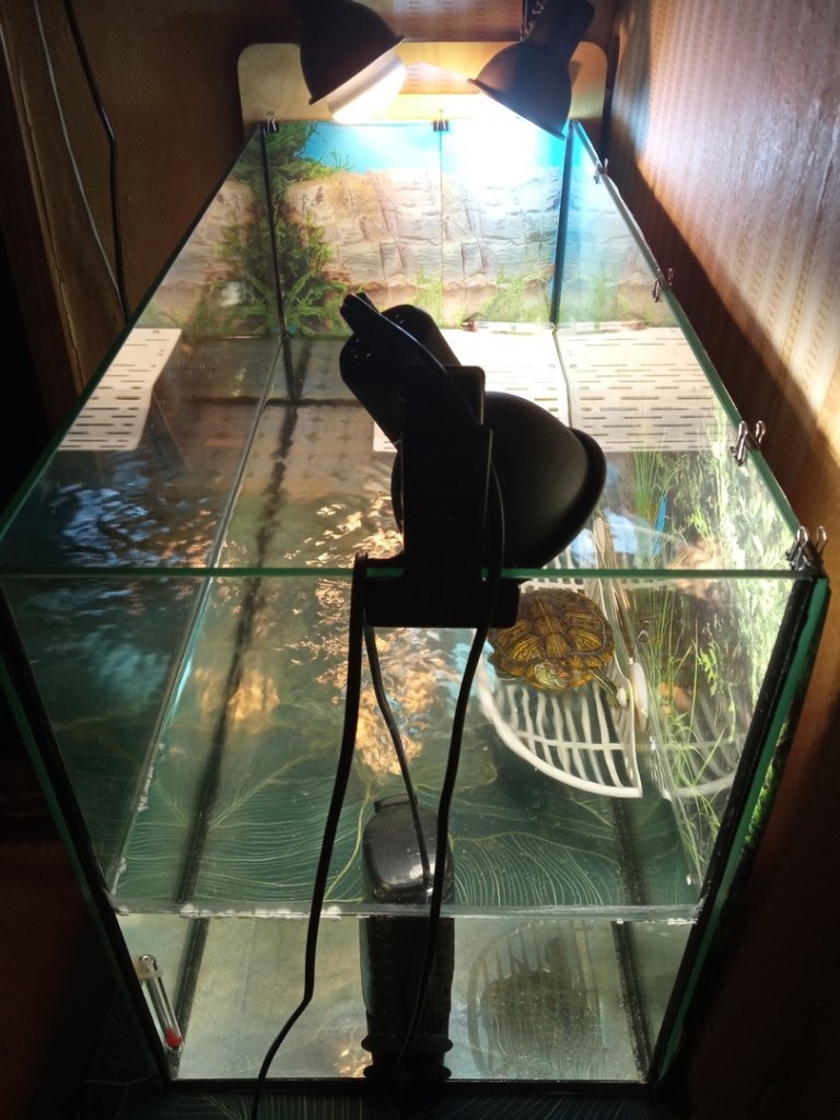@Ksanna Чтобы корректно измерить температуру на суше, нужно, чтобы кончик спиртового термометра находился в центре светового пятна (если термометр спиртовой) или весь термометр целиком находился в центре светового пятна (если электронный). Лепить термометр на стенку рядом с точной прогрева не нужно (если я верно понял смысл данной фразы), так как он там покажет совсем не ту температуру, что в точке прогрева. Температуру лучше замерять как на уровне лап черепахи, так и на уровне панциря, положив термометр на возвышение, равное по высоте панцирю черепахи (в качестве возвышения лучше использовать что-то твердое, что черепаха не сможет съесть - моя недавно сожрала хозяйственную губку, на которую я клал градусник) - чем меньше перепад температур между уровнями, тем лучше. Нет, это не просто неудобно, но и абсолютно бессмысленно в случае с черепахами - температуры и уф (расположение, высоту и угол поворота ламп) гораздо удобнее настраивать отдельно, так как эти моменты будут меняться в процессе эксплуатации и зависеть от температуры воздуха в квартире, характеристик ламп и степени выгорания уф-лампы. Норм На основании чего вы сделали такой вывод? Уф-компакты от Sera, если верить информации на форуме, это довольно слабые лампочки, которые могут удовлетворить потребности черепахи в уф, если только их привязать к черепахе веревкой)) Они не нравятся черепахе в первую очередь потому, что она к ним еще не привыкла. Когда я заменил уф-лампу с 13вт на 26вт, моя трое суток на сушу не выходила (залезала на трап, вертела головой и возвращалась в воду), но потом привыкла и сейчас ей пофиг. Но лично я в данной ситуации вообще не вижу смысла в этой крышке с лампами. Я считаю, что двух ламп (греющая и уф) + освещение в комнате - вполне достаточно для аквариума таких размеров. А если вы хотите, чтобы после выключения основных ламп черепаха немного поплавала при свете, то можете просто установить простенькую подсветку. Я в качестве подсветки в начале использовал третий светильник со светодиодной лампочкой в противоположном углу аквариума (см. фото), но водоросли в том углу очень бурно цвели и захватывали весь аквариум, потом заменил ее на светодиодную трубку вдоль всей длины аквы (см. фото) - водоросли так же плодятся, но менее концентрировано и не с такой скоростью.