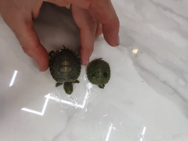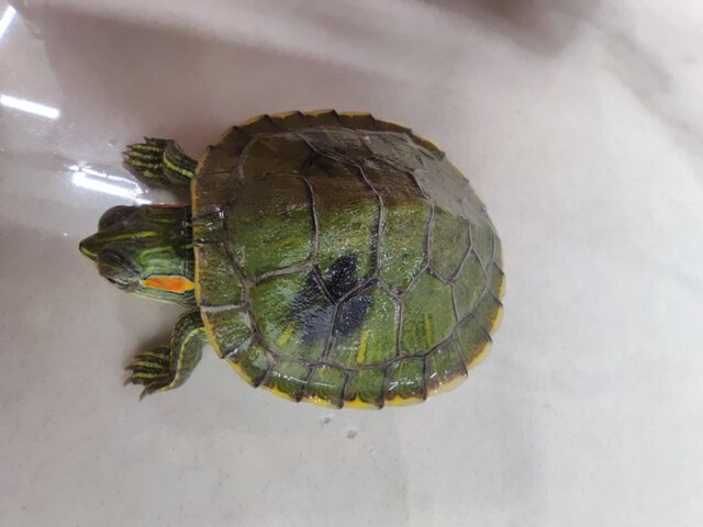 Добрый вечер! Красноухая, приобрели 3 месяца назад двух черепашек, возраст малый неизвестен, по размеру сантиметра 4 были. Одна из них всегда отличалась малой подвижностью, со временем перестала совсем есть, не ныряет т.е. Если в воде то на поверхности как поплавок, так же заметили темные пятна на панцире, по сравнению со второй совсем не ростет. 1- Липецк 2- красноухая 3- контейнер примерно 12, воды около 7л, мостик лампа с валберизз 2в1, со временем заменим жилище и лампу 4 - Лампа светит 8-12ч, температура не известна, фильтра пока ещё нет, воду меняем раз в неделю и один раз частичная замена 5 - на дне камни, ракушки 7 - как приобрели давали около 1,5 месяцев гаммарус, потом перешли на reptomin и пару раз в неделю лакомства сушёные рабы креветки и прочая живность
