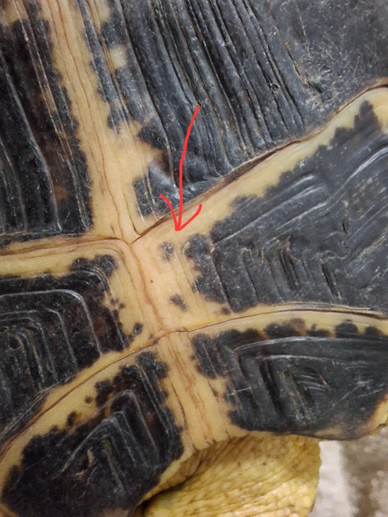 Здравствуйте! С момента моего крайнего сообщения соли выходят практически каждый день. Сначала продолжали выходить твердые камушки (прикрепляю фото от 26 сентября), сейчас последние 3 дня выходят как сметана с вкраплениями песочка. Только что после купания заметила на пластроне небольшое розовое пятно (как линия, похожая на ту, которая была на карапаксе из сообщения выше). Оно было едва заметно, но точно мне не померещилось, т.к. я показала его старшей сестре, и она его тоже увидела. Пока вытирала Ариэла после купания и делала фото, пятно исчезло. Отметила на фото место, где оно было, стрелкой. Подскажите, что это могло быть? Тоже сосуд из-за того, что он тужится? Или это уже может говорить о почечной недостаточности? 😰 Самое страшное для меня - это увидеть что-то розово-красное на пластроне(( -