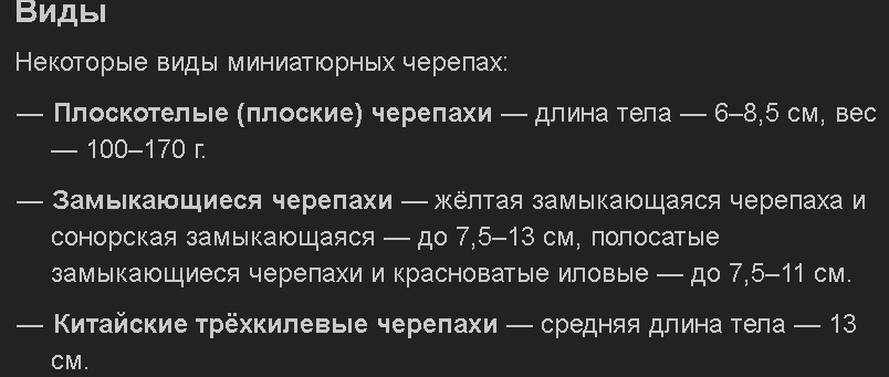 @пашок гугл выдал вот этих черепах, но они все полуводные. Я думаю, сухопутных миниатюрных нет. И по моему мнению с водными проще, чем с сухопутными. Оборудование практически такое же. Но не надо их купать и увлажнять им почву. Так же водных можно кормит кормом, может это немного дороже (хорошие корма могут быть дорогими). И проблем с солями у водных обычно не бывает. Только менять воду и очень редко фильтр чистить. В качестве водоема можно использовать пластиковые емкости, а не тяжелые стеклянные аквариумы. В финансовом плане одинаково затратно. Я люблю воду и мне интересно в ней возиться. Но это все индивидуально. Возможно, кто то знает лучше ☺️ -