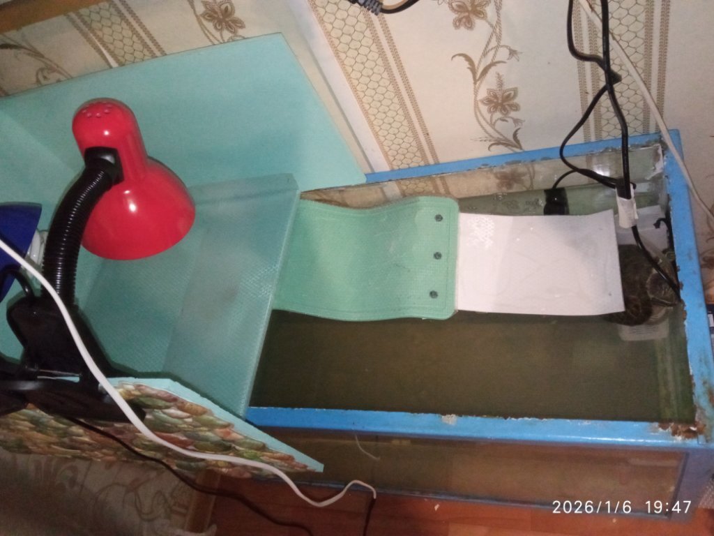 1. Из какого вы города (области)? Ваш возраст? - Город Набережные челны, Татарстан мне 23 года, черепахе мы не знаем сколько, по всей видимости ей меньше года 2. Вид черепахи? Если не знаете, просто укажите водная. - Красноухая черепаха 3. Где содержится (пол, аквариум, террариум, контейнер)? Размер жилища? Какой объем воды в литрах? - Содержится в аквариум-террариуме 10 литров, объем воды соответственно примерно 9 литров размер 30.6x19.6x18.4см https://ozon.ru/t/9weKxzq уже вычитал в вашем форуме о необходимости аквариума в 100-200 литров 4. Какое стоит оборудование? 4.1. Установлена ли лампа накаливания в качестве точки прогрева? Сколько часов работает в день? - да установлен, 25w периодически включаем и выключаем, так как точка прогрева получается слишком горячей уже прочитали в форуме о необходимости постоянной работы с уф лампой 10-12 часов для этого увеличили расстояние по высоте до берега и теперь постоянная температура 33.7 в точке прогрева 4.2. Установлена ли ультрафиолетовая лампа? Если да, то с каким спектром UVB%? Как называется и как давно установлена? Сколько часов работает в день? - да установлен, но после обнаружения проблем с черепахой, в сравнении с лампой накаливания работает как положено 10-12 часов в день, производитель wacool uvb 5.0 13w 5%uvb 4.3. Установлен ли берег? Что используется в качестве берега? - да, пластиковая подставка со ступеньками 4.4. Установлен ли фильтр для воды, если да, то какой, внешний/внутренний? Какая мощность? -да, внутренний фильтр, мощность не известна, он скорее всего самый дешёвый, но такой объём воды фильтрует хорошо Покупался на озоне набор аквариум, нагрев. Лампа, фильтр, берег https://ozon.ru/t/9weKxzq 4.5. Установлен ли нагреватель воды? - да, но после обнаружения проблем с черепахой, сейчас температура воды 28 градусов 5. Имеется ли грунт в жилище черепахи? Если да, то какой? -нет, только маленькие камни галька и маленькие ракушки 6. Какая температура в жилище черепахи (воздуха/воды)? - воздух 33.7 градусов, так же был приобретён термометр только после обнаружения проблем с черепахой - вода 28 градусов 7. Что черепаха ест и как часто? Какие даете подкормки и как часто? - на данный момент абсолютно ничего не ест уже неделю. Изначально черепаху забирали у родственников 30 ноября 25г., так как она им была не нужна и условия для него были вообще не подходящие, давали то что было у них, это какие то сухие маленькие червячки, и гранулы Тортила. После изучения условий жилья (как вы поняли, мы получили не всю информацию) для черепахи мы приобрели данный набор, ссылка выше, и думали что на этом все хватит, в добавок купили корм Tetra Repto mini junior кормили и сухими червячками и Тетрой два раза в день по размеру его головы Далее нам предложили купить замороженную моль (маленькие тонкие красные черви), которая продается в кубиках и сказали кормить два раза в день четвертинкой и после прочтения форума, я так понял, это стало главной ошибкой и перекормили и вообще нельзя было их давать 8. Возраст, точный вес и длина панциря черепахи? В чём проблема/болезнь? Как давно проявилась? - возраст как мне кажется менее года, вес ничем измерить не можем, длина панциря 4см, пишу уже поздно ночью, утром могу купить весы Болезнь заметили 27 декабря 2025, после изучения тематики болезней, мы поняли наши изначальные упущения, и 29 числа докупили термометр для воды, один снаружи (тонкая полоска которая клеится на стекло),