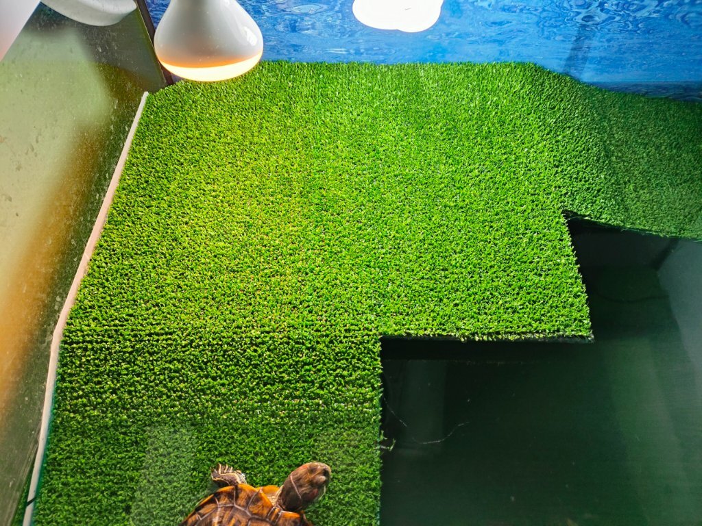 Пока жду Reptispa Desert 10% 26W - использую лагуну 5% (13см в ближней точке) в таком виде. Температура воды 25, температура на суше под лампами 32, измерение проф. тепловизором. -