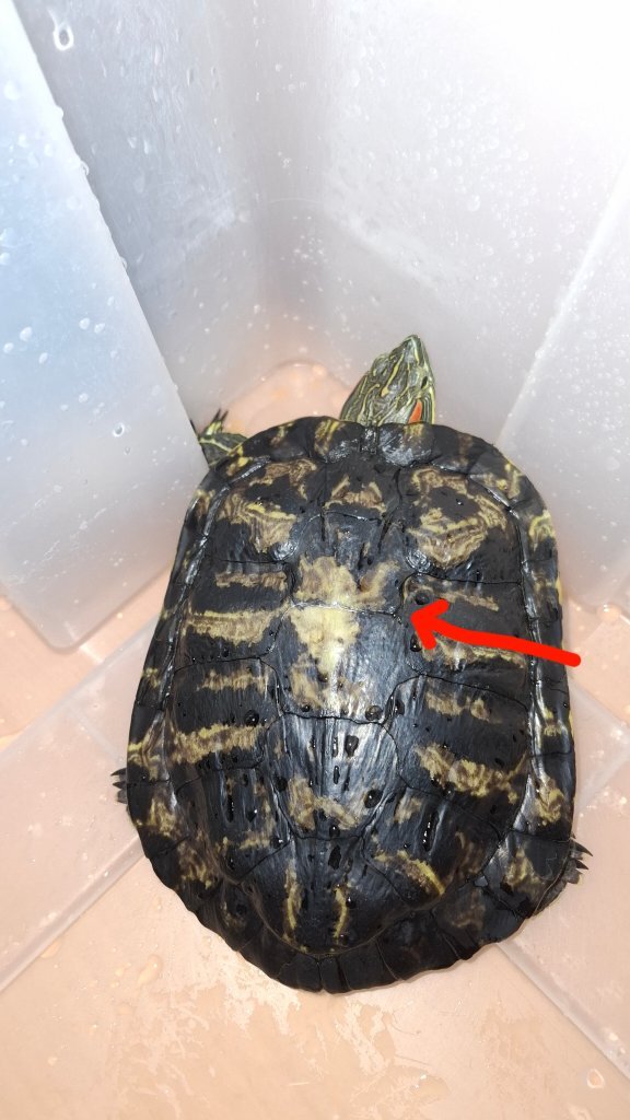 1.Из какого вы города (области)? Ваш возраст? Тульская обл. Новомосковск 2.Вид черепахи? Если не знаете, просто укажите водная. Красноухая 3.Где содержится (пол, аквариум, террариум, контейнер)? Размер жилища? Какой объем воды в литрах? Контейнер на 120л, воды 60л (знаю что этого не достатчно, в процессе улучшения условий) 4.Какое стоит оборудование? 4.1. Установлена ли лампа накаливания в качестве точки прогрева? Сколько часов работает в день? Да, зеркальная лампа 40вт, в день около 10 часов работает 4.2. Установлена ли ультрафиолетовая лампа? Если да, то с каким спектром UVB%? Как называется и как давно установлена? Сколько часов работает в день? Да, Reptispa Desert 10.0 4.3. Установлен ли берег? Что используется в качестве берега? Да, 2 больших камня(галька) 4.4. Установлен ли фильтр для воды, если да, то какой, внешний/внутренний? Какая мощность? Да, внутренний, Asap 700 на 100-250л 4.5. Установлен ли нагреватель воды? Нет 5.Имеется ли грунт в жилище черепахи? Если да, то какой? Нет 6.Какая температура в жилище черепахи (воздуха/воды)? Воздух 28/ вода 24 7.Что черепаха ест и как часто? Какие даете подкормки и как часто? 2 раза в неделю MarineLife, сепию иногда даю, в голодные дни по наличию даю листья салата 8.Возраст, точный вес и длина панциря черепахи? В чём проблема/болезнь? Как давно проявилась? Возраст 23-25. Проблема заключается в том, что я при смене воды мыла черепаху и помогла ей полинять, аккуратно ногтем Где щитки начинали отходить я их подковыривала и снимала, где не получалось там не трогала. Отпустила ее в воду и там заметила, что между двух щитков по середине появилась полоска, раньше такого не было. Очень переживаю за черепаху тк недавно умерла первая которая с ней жила вместе, по ее проблеме я уже писала сюда, по мере возможности улучшила условия за исключением объёма воды и корма, пока что это в процессе. Подскажите сталкивались ли вы с таким и что делать? Черепаха активно плавает сейчас и ест как обычно. 9.Обращались ли в ветклинику? Как называется ветклиника? Как зовут врача (ФИО)? Вводились ли какие-то препараты, если да, то в каких дозировках? Что было сделано по рекомендациям врача? Нет К анкете приложите фотографии жилища и самой черепахи (чтобы на ней была видна черепаха и её болезнь, а также: вид сверху, по бокам, пластрон). Переместите фотографии в поле редактора сообщений или нажмите на кнопку в редакторе "Выберите файлы" (суммарный вес прикрепляемых изображений 5MB, если ваши изображения превышают указанный размер, то воспользуйтесь любым хостингом изображений, и прикрепите ссылки на размещенные изображения в десятом пункте анкеты). Извините 2 раза случайно опубликовала одну и ту же тему, как удалить не разобралась -