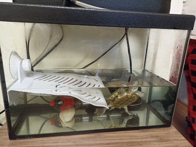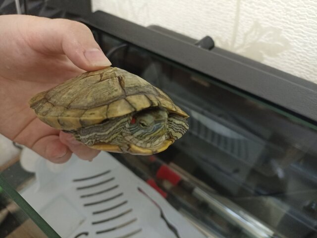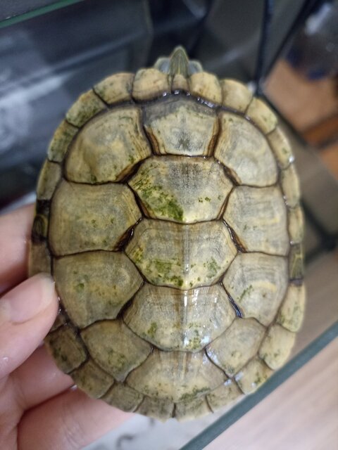 Я из города Киров, мне 22 года. Вид черепахи — красноухая, мальчик. Возраст — два года У родителей он стоял на подоконнике, у меня стоит на тумбочке у стены. Размер точный я не знаю, аквариум литров 20. А ему мы наливаем 5 литров воды. Из оборудования — обогреватель, фильтр. Я покупала ещё уф-лампу, но родители её не использовали. У лампы 97% UBA и 3% UVB. Берег установлен, пластиковый, 20х12см Фильтр установлен, но не знаю мощность. Литров до 50, вроде. Обогреватель есть, на 30 литров. Грунта нет. Температуру между 20~25 градусами держим. Корм используем — палочки для черепах, гаммарус, креветки. Кормим 2 раза в неделю 2 года, в январе будет 3. Вес не скажу, у нас нет весов, а длина панциря примерно 10 см. Я не уверена болеет ли он, просто у него панцирь будто расслаивается и он весь в водорослях. Как давно появилась не знаю. В ветклинику не обращались. Так-то он кушает, активный вроде. Но.. не знаю что и как с ним