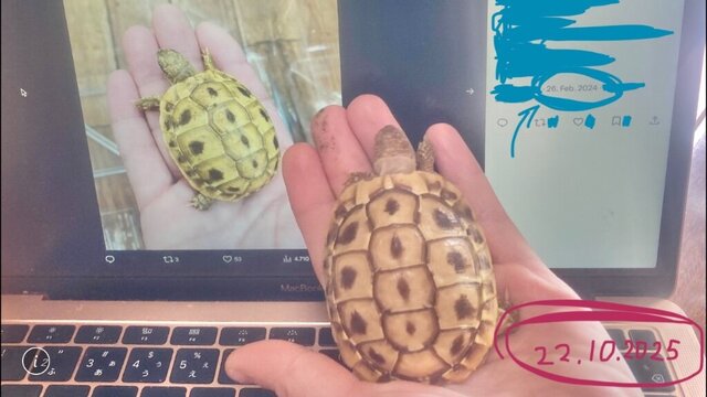 2. Купила мою черепашку в сентябре 2025г. Вид- Западная черепаха Германа. Опыт с содержанием черепах есть, но не с этим видом, поэтому не задалась вопросом, почему она в свои 2 годика такая маленькая (~62грамма). Покупала в Японии, в зоомагазине(не у браконьеров). С самого начала она потирала себе глазки и вяло кушала(по сравнению с моей другой черепашкой того же вида). *Лампы подогрева, влажность воздуха, террариум и пр по норме. Спустя примерно месяц стала задумываться, что это не совсем норма, как она кушает и что не набирает вес. Тк она не совсем обычная черепашка (частичный альбинос) то я ее легко нашла по интернету: фотографии из прошлого магазина, фотографии ее и ее братика (точно такого же размера). Затем я разыскала настоящего хозяина её братика и списалась с ним. Когда он прислал мне фотографии черепашки я очень удивилась, он почти в четыре раза больше чем его сестричка(или братик, пока не знаю..). Сейчас моя черепашка почти не кушает сама и весит всё ещё около 70 грамм, в то время как ее брат весит около 200гр! Кормлю её сейчас через шприц немного размоченным кормом с добавлением витаминов А и пр. Купаю каждый день в ромашке. У герпетолога конечно же была, но там мне сказали что она сильно маленькая чтобы брать у нее кровь на анализы. Прописали лишь порошок от глистов. Она была уже значительно меньше своего брата до того, как я ее купила, так что может это у неё врождённое..? Или это какая-то болезнь? Посоветуйте пожалуйста.