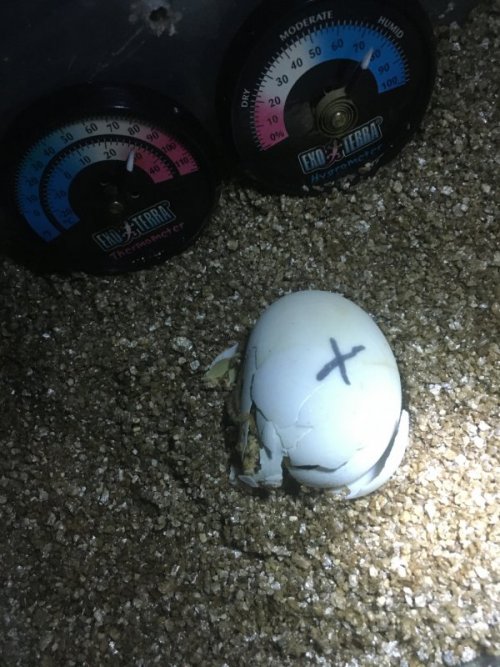 Тем временем идет 114-ый день инкубации, еще одно яйцо из 4 оказалось жировое, итог 2 живых и 2 жировых, восполнил влажность, яйца почти полностью стали не видны на просвет, что говорит о финальной стадии формирования черепашат. В прошлой кладке, малек проклюнулся спустя 5 месяцев и 9 дней инкубации, посмотрим какой будет результат на этот раз.2 балла