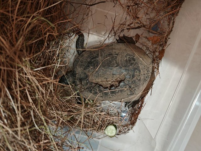 Черепахи в плане активности довольно странные животные, мои могут целый день ходить копать и греться под лампами а могут и просидеть в сене раз в день погревшись, причем у меня 3 черепахи и у всех 3 разные биоритмы1 балл