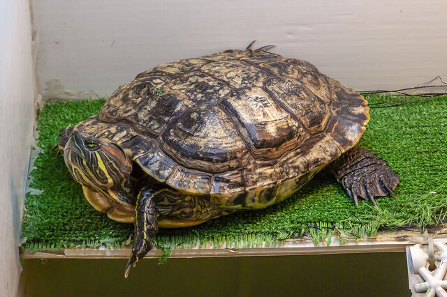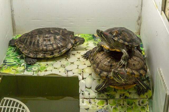 Расскажу про взаимоотношения моих черепах. Я много читала, что разнополых черепах нельзя содержать в одном террариуме. Но выбора у меня не много, второй террариум ставить совсем некуда. Когда я спасла Матильду из офиса, конечно я сразу подумала об этом. В офисе у Моти был большой аквариум, и мне даже предложили его забрать, но перевезти и затащить его на 5-й этаж тогда у меня не было ни физической, ни материальной возможности. Да, мои разнополые черепахи живут в одном террариуме метр длиной. Знаю что маловато, но надеюсь ежедневные прогулки по комнате, компенсируют тесноту террариума. Но самое главное, черепахи живут мирно, не дерутся, не делят территорию. Борщ не пристаёт к Моте со своими ухаживаниями, даже весной, когда начинается гон. Они мирно спят под лампами или расходятся по своим домикам. Причем каждый в свой домик. Уж не знаю, как они их поделили, но ведь ошибаются крайне редко. Но! Стоит только выпустить на пол или на балкон, вот тут начинается. Борщ проявляет необычайную активность, бегает вокруг Моти и кусает её за лапу. Причем он именно бегает, я даже не думала что черепахи могут носиться с такой скоростью. Мотя в свою очередь прячется в панцирь и поджимает хвост. И каждый раз рывком сбрасывает Борща с себя. Продолжается это всё минут 10-15, потом Борщ теряет интерес к Моте и уходит по своим делам, больше в этот день он интереса к подруге не проявляет. Кстати комнату они тоже поделили, Борщ курсирует вдоль одной стены, Мотя вдоль другой. Встречаются посередине, где мирно едят и потом опять расходятся. Сначала я конечно переживала, разгораживала комнату, убирала Мотю от возбужденного Борща. Но потом, понаблюдала и поняла что ничего плохого не случается. Травмы и яйца мне не грозят. Так происходит уже третий год, и надеюсь что так будет и дальше. А ещё несколько раз я наблюдала такую картину. Если вдруг Борщ отдыхает или мирно сидит в углу комнаты, Мотя разбегается и бьёт его своим пластоном. А потом уходит и занимается своими делами, больше не проявляя к Борщу интереса. Но так она делает только когда Борщ расслаблен и сидит без движения. Вот что это? Агрессия или что-то другое? Впрочем это происходит довольно редко. Я не знаю, как долго продлится такая идилия, страшно что они могут начать драться в аквариуме, а уж разгородить комнату или балкон труда не составит.3 балла