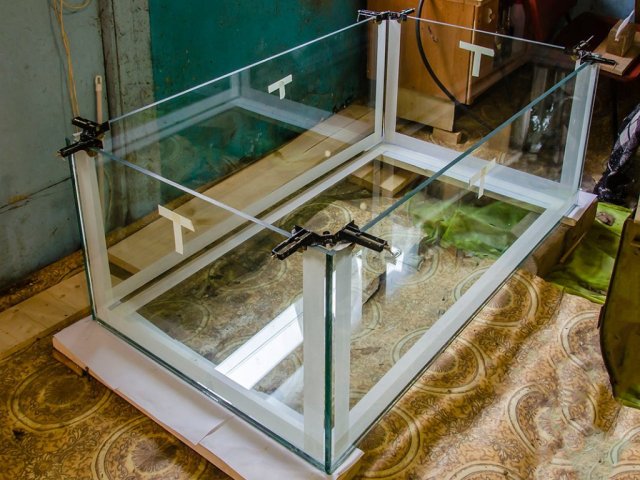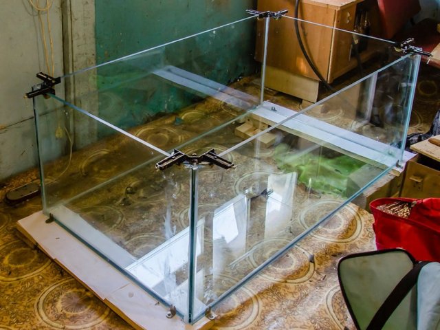 Здравствуйте, друзья. Представляю подробную инструкцию для склейки аквариума самостоятельно. Инструкция для начинающих – профессионалы делают не так, но по этой инструкции сложнее ошибиться и все испортить. Хотя большие аквариумы (больше 600л) обычно так и клеют ! Сначала определитесь с размерами, для черепахи не нужно высоту больше 55см, для одной черепахи можно сделать высоту 50-55см, для нескольких – высоту 55см. Длина лучше значительно больше ширины, НО : именно длина определяет толщину стекла – самый дорогой компонент аквариума, поэтому если позволяет место - лучше сделать больше объем, пусть даже при этом длина будет всего лишь немного больше ширины. Ширина на толщину стекла не влияет. Вот параметры, при высоте до 55см : длина до 60см – стекло 6мм, длина 60-80см – стекло 8мм, длина 80-100см – толщина стекла 10мм, длина 100-130см – стекло 12мм. Все – без ребер и стяжек, если сделать ребра – толщина стекла уменьшается на 2мм, но пользоваться им будет менее удобно. Стяжки – ИМХО, полностью не допустимы. Ребра не описываю – по моей инструкции все без ребер/стяжек. Также нужно приобрести силиконовый герметик ДЛЯ АКВАРИУМОВ – любой другой не годится. Лучший – Чемлюкс (увы, сейчас его не достать) и Момент/Гермент. Но приходится выбирать из того, что есть… Для аквариума до 200л хватит 2 тюбиков, хотя – первый раз уйдет намного больше, поэтому лучше взять 3 – склейку прерывать нельзя. Для герметика нужно также строительный пистолет. Стекла ставятся – боковые короткое внутрь длинных, дно внутрь боковых стекол. Т.е. Длинные боковые стекла – (длина) x (высота) (2 шт.). Короткие боковые – (ширина)-(2 толщины стекла)-3мм (два зазора по1,5мм) x (высота) (2шт). Дно – (длина)-(2 толщины стекла)-3мм x (ширина)-(2 толщины стекла)-3мм. (1шт.). Заказываете в мастерской нужные стекла, и можно сразу заказать шлифовку ТОЛЬКО верхних кромок боковых стекол, склеиваемые стекла не шлифуются. Можно отшлифовать и самому, зажимаете стекло (например, в струбцине) и шлифуете одну кромку шкуркой (средней зернистости). А можно заказать ПОЛИРОВКУ всех кромок всех стекол, так будет точнее и лучше потом работать, но это намного дороже. Нужно приобрести (или у кого-то взять) 4 угловые струбцины, без них точно не сделать. Нужен также – ацетон, малярный скотч, 8 саморезов и 8 мелких монет – лучше взять 10коп, но если не найдете – 50коп, от 1рубля уже слишком толстые, можно также взять аналогичные по толщине другие монеты (например, советские). Берете опору – или большой лист фанеры, доску или ДСП размером больше дна аквариума, или 4 доски прибить (привернуть) квадратом, чтобы на них установить стекла. Дальше нужно обезжирить стекла, в первую очередь места склейки (но лучше всю поверхность, для гарантии). Обезжиривать лучше ацетоном. После обезжиривания наклеиваете полоски малярного скотча рядом со склеиваемыми сторонами стекол, с внутренней стороны – на дно вдоль всех сторон, на остальные стекла – вдоль трех (кроме верха). Наклеивать на внутренние стекла (дно и боковые стороны длинных стекол) – на расстоянии 5мм от края, на внешние стекла (нижняя сторона длинных стекол и все стороны коротких стекол) – 6,5мм + толщину стекла. 5мм это образуется галтель – расширение силикона изнутри, для прочности. После обезжиривания до склеиваемых краев руками не дотрагиваться (лучше работать в тканевых перчатках). Кладем на раму бумаг