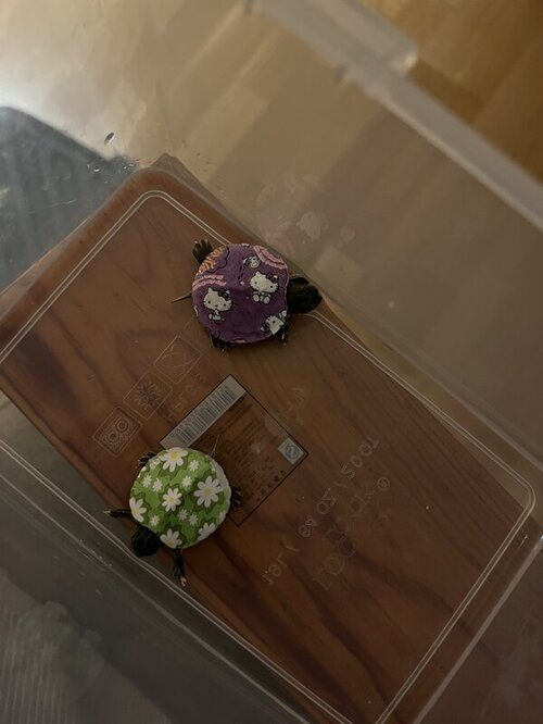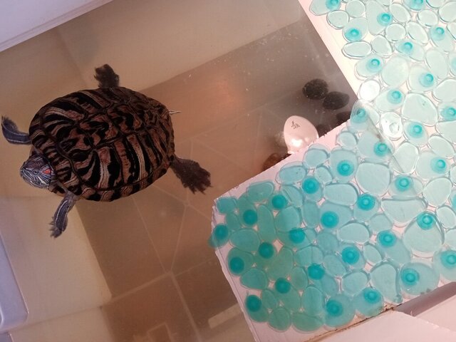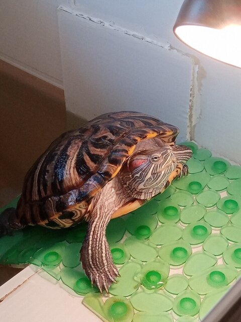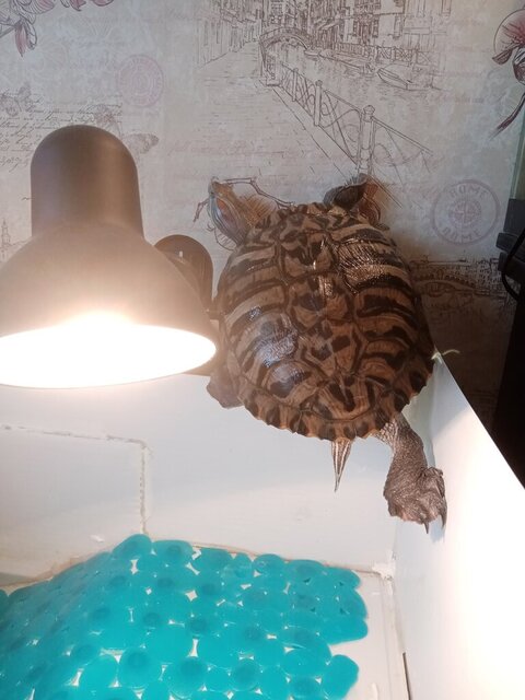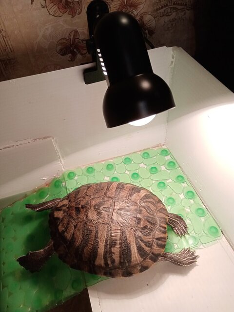 Доброго! Вообщем, ситуация такая. Вывезла с собой в эвакуацию брошенную недохозяевами крошечную красноушечку. Случайно обнаружила в аквариуме с уже уснувшими от холода рыбками. Её туда просто закинули, покидая дом, ничего никому не сказав. Была очень вялая, но живая! Сколько дней она не ела, трудно сказать, судя по всему около недели. Отогревала её на себе, носила в кармане. Пыталась греть воду над свечкой, что малореально. Так что черепаха проводила много времени в холодной воде, в помещении при 13-15°. Полностью без воды держать её не решилась. Грела ежедневно в руках и опять в кармане носила. Кормила. Совсем не кормить, несмотря на холод, тоже не решилась. Вообщем, немного растерялась, как не навредить, доступа к инету не было. Так провели дня три-четыре. Потом попали в тепло, когда нас вывезли в столицу. Но лампы - обычной - так и не нашлось. Тем не менее, в теплом помещении черепаха сразу покакала, чем очень обрадовала. Я стала кормить её ежедневно. Так провели два дня и после почти сутки в дороге, во внутреннем кармане. Пару раз увлажняла, заворачивая во влажную тряпочку, и часто давала подышать. Доехала благополучно. Довольно активна, кушает, какает. Сейчас оборудуем ей временное подобие акватеррариума с островком американкой. К сожалению, фильтр и всё прочее, как и нормальный аквас, сейчас нереально сделать. Никак. Отсюда первый вопрос: воду придется менять полностью, учитывая отсутствие фильтра. Контейнер на 12 литров, но налить выйдет меньше. Как часто менять воду? Греть воду тоже отдельная проблема, нагреватель - очень вряд ли(( планирую попробовать греть термоковриком на двоих с эублефаром. Какая минимально допустимая температура воды? Лампа УФ и накаливания над островком, к счастью, есть. Второй вопрос, чем можно покрыть островок и трап, что не навредит черепахе? Все возможные варианты, "травку" не факт, что я сейчас найду. Корм - гранулы (на фото). Чудом их нашла у недохозяев, там же и выяснилось, что раньше жила черепашка в этом жутком сооружении, что все знают: овальная пластиковая лохань с уровнем воды "лужа", и посредине возвышение. Естественно, без ламп. Помимо гранул обнаружила гаммарус (как же без него). Разумеется, его не забирала, но сколько черепаха на нем жила, неизвестно. По поводу гранул, сколько в день ей их можно давать? Даю по одной. Достать нормальный корм под большим вопросом, не факт, что реально. Буду искать, но... Как то так. Очень надеюсь сохранить это маленькое стойкое существо здоровым, сделаю все, что смогу, учитывая обстоятельства. Дай Бог такие спартанские условия ненадолго, но зарекаться не возьмусь. Буду благодарна за советы, спасибо заранее.4 балла