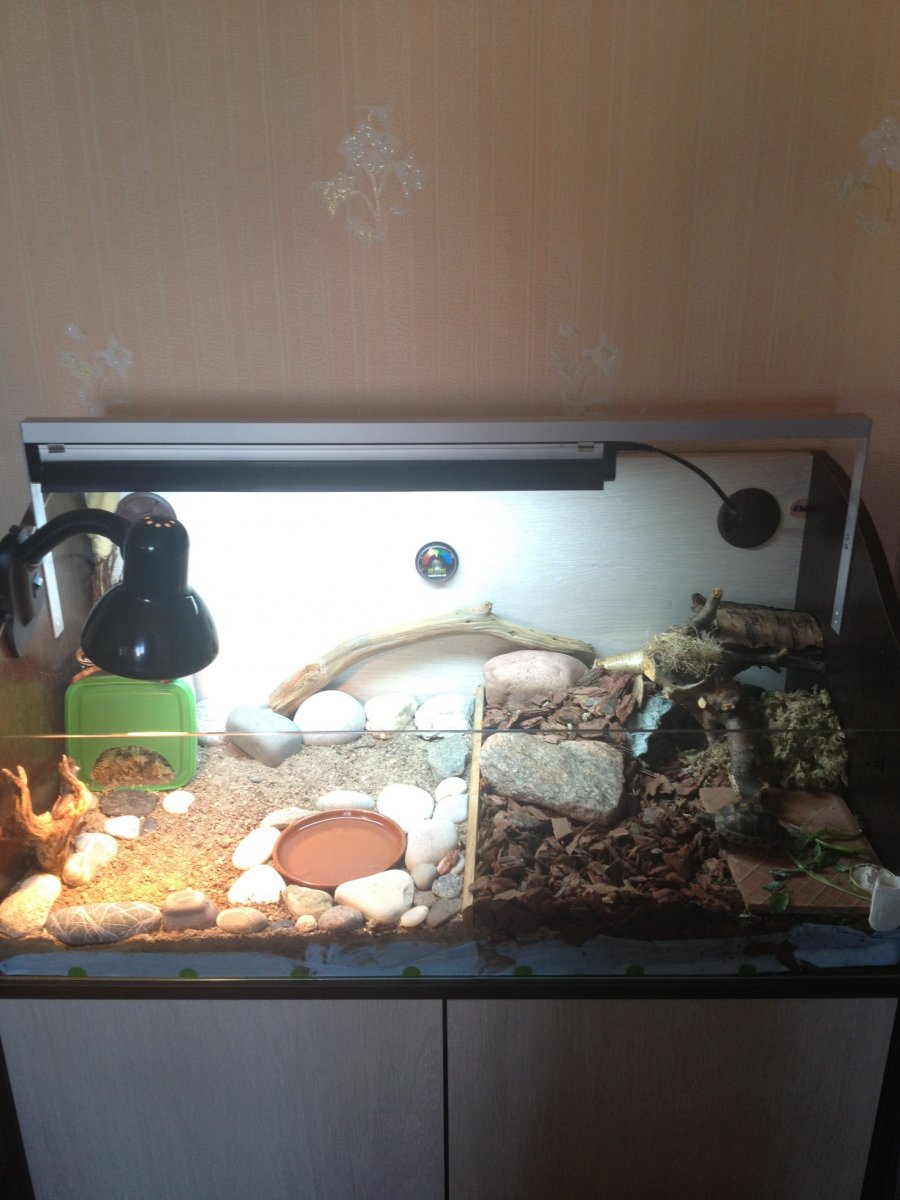 Vallency Имя: Марина Локация: Москва Опубликовано: 10 июня 2019 Автор Опубликовано: 10 июня 2019 Добрый день! Фото террариума,размеры 85X45 высота задней стенки 36 см,высота передней 26.Черепашка маленькая,так что хватает.Сейчас в поиске как лучше обустроить терр,но в первую очередь нужно определить вид и подвид черепашки.После обсуждения попытаюсь создать условия,хотя бы приближенные к природным.Если есть ошибки, и будут пожелания по устройству терра пишите.Всё приму к сведению? .