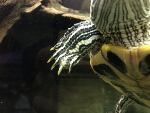Kazarl Ваше имя: Сергей Локация: Москва Опубликовано: 18 марта 2020 Опубликовано: 18 марта 2020 Доброго дня! Несколько месяцев назад у красноухой черепахи на передней лапе у когтя сначала появилось нечто похожее на налёт коричневатого цвета (бактериалка была?), потом стала покусывать лапу, видимо беспокоила. Рисунок на когте пожелтел, сам коготь заметно стал толще и приобрел вид схожий с ногтевой пластиной пораженной грибком у человека, вокруг когтя появились зазоры между когтем и окружающей чешуёй. Третья неделя ежедневных купаний в бетадине, потом по нескольку часов сидение в сухом боксе с мазью Тербинофин на пораженном участке. Вода (объем воды примерно 70 литров) с метиленовым синим всё это время, подмена раз в неделю, фильтр внутр. Ехейм на 300 л/ч. Некоторое улучшение вроде бы есть, зазор между чешуёй и когтей почти пропал, кусать лапу перестала, но дело продвигается довольно медленно, поэтому уверенности в том, что делаю всё правильно нет. Так что, прошу совета. УФ лампа свежая (5-ка рептигло), температура в норме, аппетит как положено отменный (рыба, сыромороженные креветки с панцирем, в летнее время+черви, лягушата, насекомые).