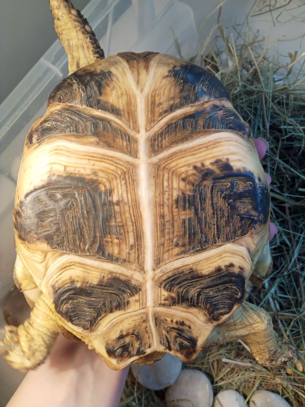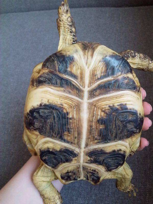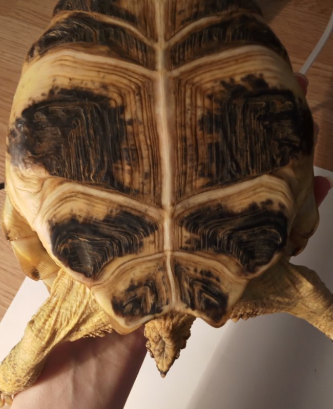 Adilya Ваше имя: Adilya Локация: Россия, Казань Опубликовано: 1 октября 2020 Опубликовано: 1 октября 2020 1. г. Казань 2. Среднеазиатская черепаха 3. Содержится в контейнере 75*55 см 4. Стоят лампа накаливания, УФ лампа Arcadia 12%, работают 12 часов в день 5. Грунт сено, галька 6. Температура под лампой накаливания 32°C, в холодном углу 26°C 7. Черепаха ест одуванчик, подорожник, крапиву, клевер, ботву моркови, салаты, примерно раз в месяц морковь/тыква/кабачок. Кормление через день. Из подкормок лежала сепия, черепаха её грызла. Кальций Arcadia недавно пришёл, успела дать только 1 раз 8. Найдена 8 лет назад, точный возраст неизвестен. Вес 838 гр., длина 14,5 см. Я обращалась за помощью на форум в январе, когда в ветклинике черепахе поставили диагноз почечная недостаточность: https://forum.cherepahi.ru/topic/4133-ostraya-pochechnaya-nedostatochnost-u-sredneaziatskoy-cherepahi/ Два дня назад после купания увидела на пластроне два ярко-красных пятна размером примерно 3 мм, которые потом перестали быть видны. На следующий день появились красно-розовые пятна намного больше по размеру (на фото). В этих местах до этого цвет панциря был более тёмного оттенка. При тёплом освещении пятна видны намного лучше, чем при естественном солнечном свете (1 фото пластрона - естественное освещение, остальные при искуственном). Черепаха довольно активная, испражняется и мочится через день/каждый день, моча с солями (обычно соли белые, бывало сероватые и более твёрдые). Когда черепаха жуёт, периодически появляется звук, похожий на скрежет. 9. В ветклинику не обращались, ничего не вводили 10. Фотографии здесь не помещаются, по ссылке: https://ibb.co/album/HN9gG0