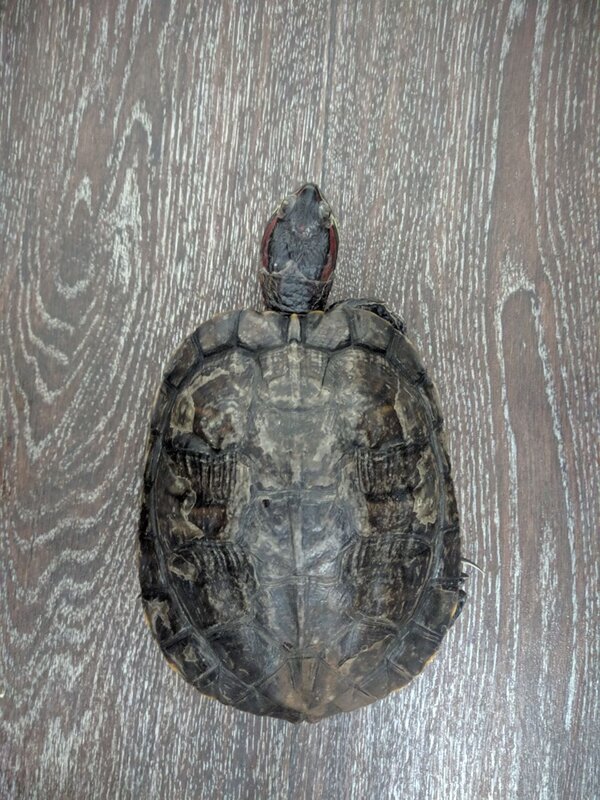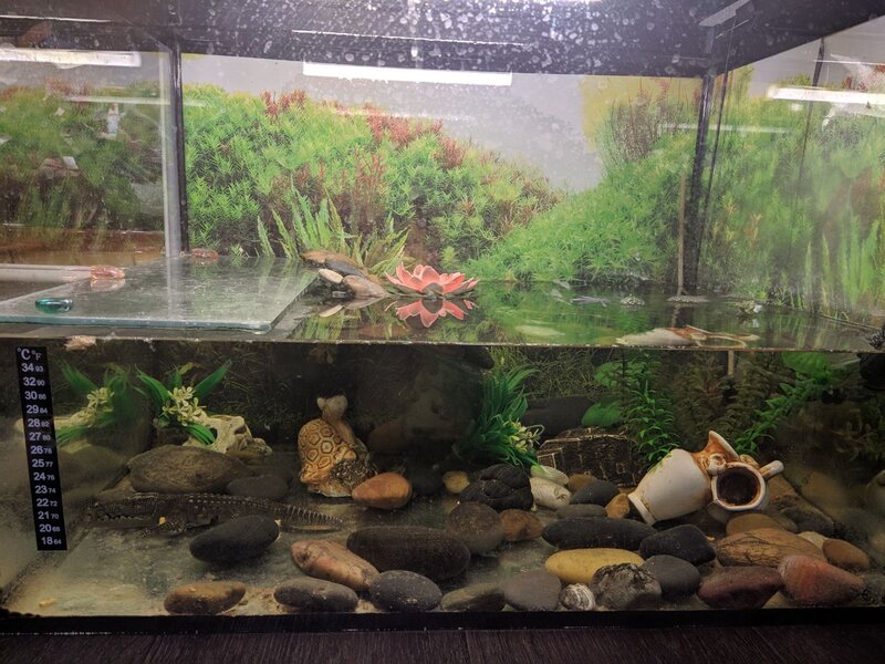 DinarYakupov Ваше имя: Динар Локация: Россия, г. Альметьевск Опубликовано: 24 июля 2022 Опубликовано: 24 июля 2022 1) г. Альметьевск. 17 лет. 2) Красноухая черепаха 3) Террариум (объём воды - 60л, общий объём - 150 л, площадь острова - 900 см^2, общая площадь террариума - 3000 см^2. Какое стоит оборудование? 4.1) Имеется лампа накаливания, работает примерно 12 часов в сутки. 4.2) УФ лампа отсутствует. 4.3) Стеклянная полка выполняет функцию острова. Подъём был обклеен камнями, чтобы черепаха не соскальзывала по стеклу. 4.4) Фильтр для воды имеется, внутренний, мощность неизвестна. 4.5) Нагреватель воды имеется. 5) В качестве грунта используются камни, которые размером больше чем голова у черепахи. 6) Температура воздуха близкая к комнатной (25-30 градусов), температуру воды поддерживаем в районе 26-28 градусов. 7) Кормим Tetra Repto Min, креветками, рыбой раз в день, но не до сыта, размер 1 приема пищи составляет примерно треть от головы черепахи. 8. Черепахе 8 лет, вес - 1.2 кг, длина панциря - 19 см. Черепаха в один день совсем отказалась принимать пищу, если и ест - то только один маленький кусочек за день. Началось с 21 июля. Черепаха ещё довольно активная. Лапы, в том числе задние, довольно мощные (черепаха может поднять панцирь над поверхностью когда ползает). Панцирь твёрдый, без внешних дефектов и пятен. На глазах отсутствуют какие-либо отёки. 9) В нашем городе я не нашел ветеринаров-герпетологов. Мы обратились в ветеринарную-клинику "Айболит" по адресу - г.Альметьевск, ул. Советская, 30. ФИО у ветеринаров не спросили. В клинике провели УЗИ в районе мягких тканей у задних лап. Результаты отправили ветеринару в формате онлайн (ветеринар в отпуске), который занимается экзотическими животными, она сделала подозрение на поликистоз в районе кишечника и матки (есть видео с УЗИ), сделали еще возможное предположение, что это могли быть яйца (но, черепаха всегда содержалась одна). За всю работу не взяли ни копейки. Ссылка на видео с УЗИ (Яндекс.Диск) - https://disk.yandex.ru/i/u3_eIW0oifVAAg