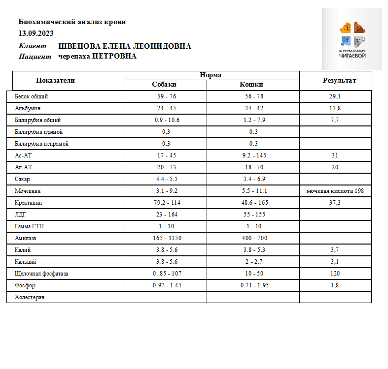 Алёна.Е. Ваше имя: Алёна Локация: Пермь Опубликовано: 7 сентября 2023 Опубликовано: 7 сентября 2023 Из какого вы города (области)? Ваш возраст? 33.пермь Вид черепахи? Если не знаете, просто укажите водная. Мускусная килеватая. Где содержится (пол, аквариум, террариум, контейнер)? Размер жилища? Какой объем воды в литрах? У меня она 2 час. До меня чуть больше месяца в маленьком аквариуме без берега. Была галька мелкая. Забрала из клиники куда его принесли на усыпление Какое стоит оборудование? 4.1. Установлена ли лампа накаливания в качестве точки прогрева? Сколько часов работает в день? Пока посадила в таз, сейчас помою и продезиныицирую аквариум в котором забрала. 4.2. Установлена ли ультрафиолетовая лампа? Если да, то с каким спектром UVB%? Как называется и как давно установлена? Сколько часов работает в день? Планирую заказать uvb 10. 4.3. Установлен ли берег? Что используется в качестве берега? 4.4. Установлен ли фильтр для воды, если да, то какой, внешний/внутренний? Какая мощность? Фильтра небыло. 4.5. Установлен ли нагреватель воды? Нет Имеется ли грунт в жилище черепахи? Если да, то какой? Галька мелкая Какая температура в жилище черепахи (воздуха/воды)? Что черепаха ест и как часто? Какие даете подкормки и как часто? Не ест уже месяц как её привезли в клинику. До этого 5 лет её кормили курицей и индейкой. Я сейчас дала минтай Возраст, точный вес и длина панциря черепахи? В чём проблема/болезнь? Как давно проявилась? 5 лет - /+ 295г Хозяева привели чуть больше месяца назад на усыпление в клинику. Врач сжалилась и не стала этого делать. Левая передняя лапа опухшая, болезненная , липкая Обращались ли в ветклинику? Как называется ветклиника? Как зовут врача (ФИО)? Вводились ли какие-то препараты, если да, то в каких дозировках? Что было сделано по рекомендациям врача? Доктор добавляла в воду какой то антибиотик. Думала о ампутация. Её диагноз онко. Однако гисталогии и анализов небыло. Верю, что ампутация и усыпление не выход для него. Возможно грибок или инфекция. К анкете приложите фотографии жилища и самой черепахи (чтобы на ней была видна черепаха и её болезнь, а также: вид сверху, по бокам, пластрон). Переместите фотографии в поле редактора сообщений или нажмите на кнопку в редакторе "Выберите файлы" (суммарный вес прикрепляемых изображений 5MB, если ваши изображения превышают указанный размер, то воспользуйтесь любым хостингом изображений, и прикрепите ссылки на размещенные изображения в десятом пункте анкеты).